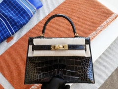 爱马仕 CC89黑色 金扣 minikelly二代 Hcp亮面鳄鱼 迷你凯莉包 纯手缝蜡线缝制