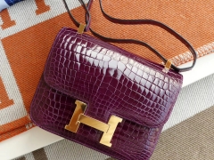 爱马仕 9G葡萄紫 水晶紫 金扣 Constance24CM 空姐包 亮面鳄鱼 银扣 纯手工手缝工艺