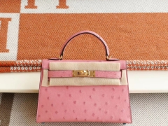 爱马仕 3Q新樱花粉 金扣 Minikelly二代 南非鸵鸟皮 迷你凯莉包 纯手缝蜡线缝制工艺