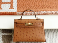 HERMES Ck37金棕 金扣 Minikelly二代 南非鸵鸟皮 迷你凯莉包 纯手缝蜡线缝制
