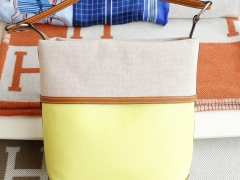 爱马仕 新款帆布水桶包超大容量(进口防水面料)金棕皮拼柠檬黄 老师傅纯手工缝制