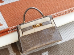 爱马仕 Ck81斑鸠灰 金扣 Minikelly二代 Hcp亮面鳄鱼 迷你凯莉包 纯手缝蜡线缝制