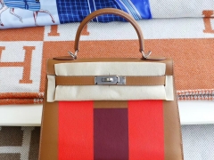 HERMES 金棕拼火焰橙拼宝石红 银扣 Kelly28外缝 Epsom拼接款 H家老师傅蜡线手缝