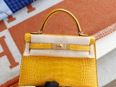Hermes 9D琥珀黄 金扣 Minikelly二代 Hcp亮面鳄鱼 迷你凯莉包 纯手缝蜡线缝制