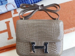 爱马仕 CK81斑鸠灰 Constance19CM 小康空姐包 亮面鳄鱼 银扣 纯手工手缝工艺
