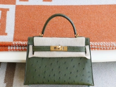 Hermes 6Q祖母绿 金扣 Minikelly二代 南非鸵鸟皮 迷你凯莉包 纯手缝蜡线缝制工艺