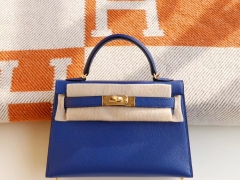 Hermes 7T电光蓝 金扣 Minikelly二代 原厂山羊皮皮 迷你凯莉包 纯手缝蜡线缝制