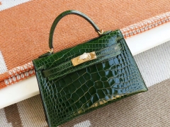 HERMES 6Q祖母绿 金扣 Minikelly二代 亮面鳄鱼 迷你凯莉包 纯手缝蜡线缝制