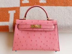 HERMES 3Q新樱花粉 金扣 Minikelly二代 南非鸵鸟皮 迷你凯莉包 纯手缝蜡线缝制工艺