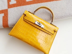 客定、9D琥珀黄 银扣 Minikelly二代 美洲亮面鳄鱼口刻 迷你凯莉包 纯手缝蜡线缝制工艺
